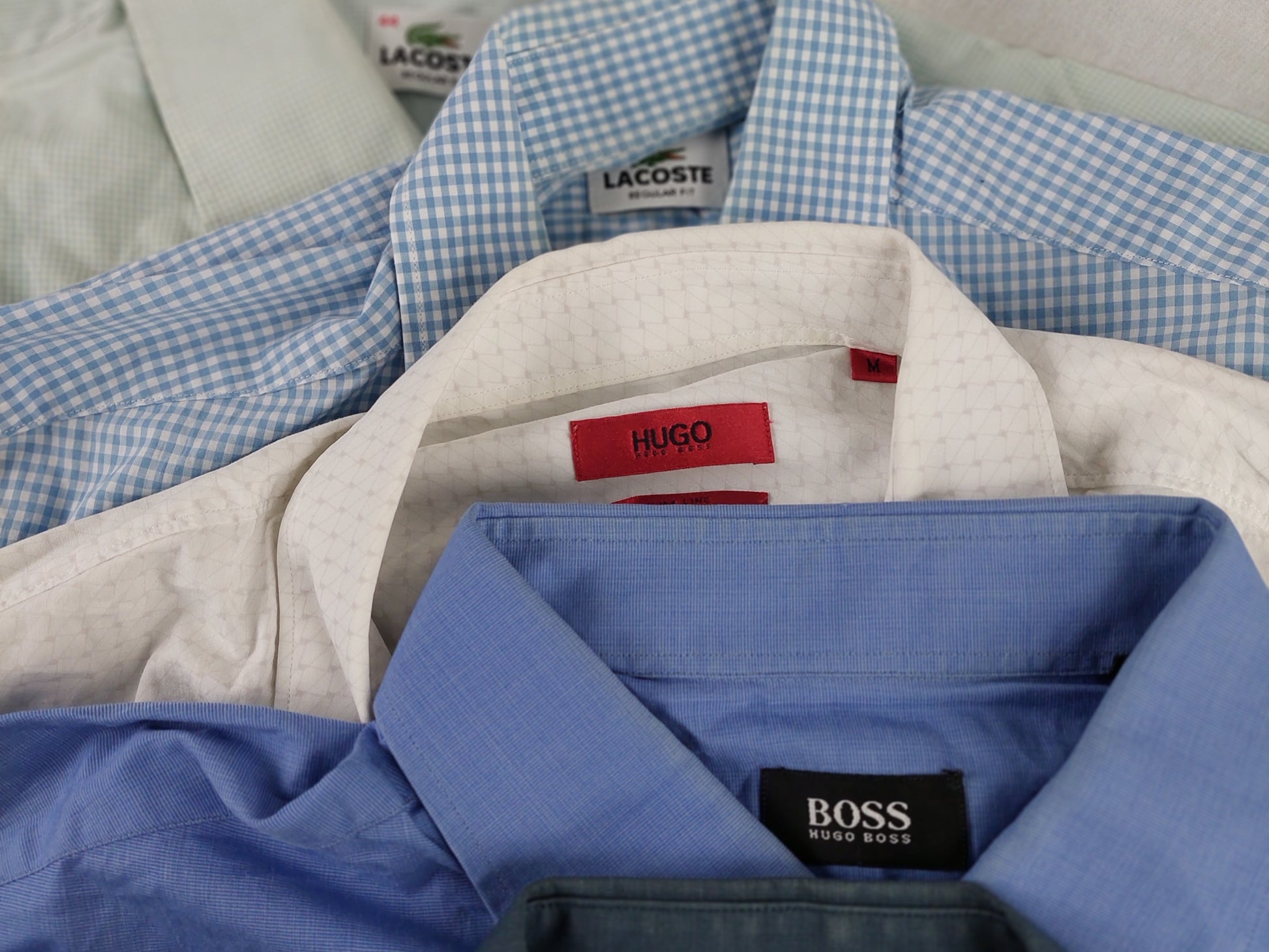 Dit pakket bevat 15 graad A en B overhemden van de merken Lacoste, Calvin Klein en Hugo Boss